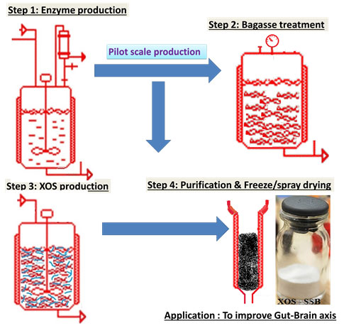 The prebiotic oligosacchrides results in higher population of probiotics producing beneficial short chain fatty acids SCFA , which leads to cascading effects like the colonocytes health, mineral absorption, anti-inflammatory, anti-diabetic, anticancer, immuno-modulatory, cholesterol, obesity and pH maintenance etc. Once produced XOS can be added like salt and pepper to the foods and feel no guilt of not having enough microfiber in the food and save your digestive system and overall health. The prebiotic oligosaccharides are also added to poultry and animal feed as supplements to enrich the nutritional value. Hence, there is a huge demand for these prebiotic oligosacchrides in India and abroad. However, there are a few Indian companies such as Tata Chemicals and Lactose India Ltd manufacture prebiotic oligosaccharides. However, these companies manufacture only FOS and GOS. There are no manufacturers of XOS in India. To meet the requirement of Indian market, XOS are imported from other countries. XOS can be cost effective since, the raw material is low cost agricultural lignocellulosic waste and the recommended daily intake dose is about 4 folds lesser than the level of FOS and GOS. Hence, development of a technology to produce XOS from these lignocellulosic materials would reduce the demand-supply gap in Indian oligosaccharide market. Towards this a technology process for XOS production has been optimized at lab scale in IIT Madras.