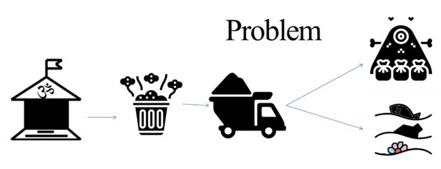 (a) collection of floral waste at place of worshipping, (b) Individual transportation. (c) Natural process of Recycling.
