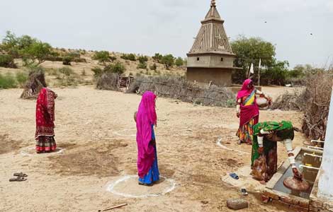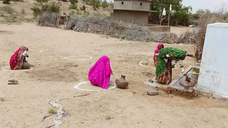 गाँव मे पानी भरने वाली महिला भी सामाजिक अंतर का पालन कर रहे है।