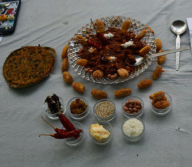Can be eaten with theplas, parathas, puri, chapattis or bajri rotlas. A winter dish because of the ingredients in it since it has iron, protein, magnesium, zinc, potassium which helps in building a strong body.