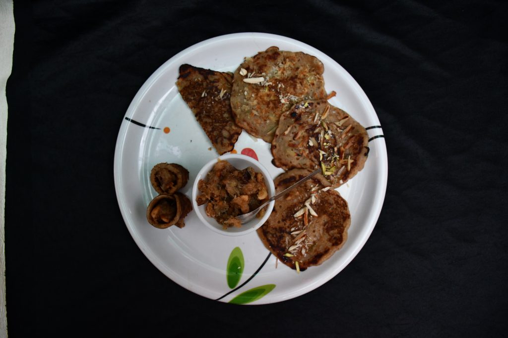 Mash the over ripe bananas, add sugar, cardamom and cinnamon powder, milk and mix well, add soaked wheat flour and make a batter and make pan cakes on a flat tava with little oil. For serving decorate it with banana small pieces, dry fruits, fresh grated coconut.