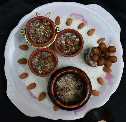 Heat cow ghee in a kadhai. Add millet flour & edible gum and roast till it gets pinkish in colour. Then add dry ginger and Ganthola powder and stir. Add water and desijaggery and allow it to boil. Add desiccated coconut and put off the gas after a minute. Add dry fruits and poppy seeds.